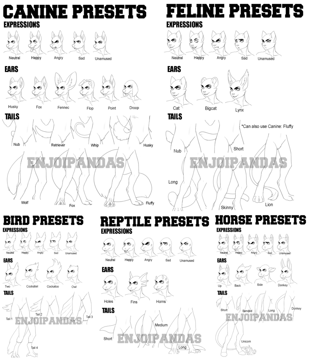 This is a digital file containing an extensive furry base to make reference sheets and adoptables on! Included with this base are also animal parts, accessories, and hairstyles to help you create fun and unique furry designs. All you have to do is color, edit to your heart’s content, and have fun!